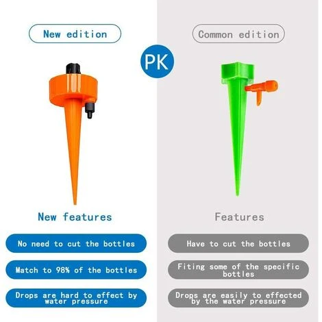 Ce dispositif d’arrosage automatique des plantes est une nouvelle version améliorée qui est facile à utiliser et convient à la plupart des bouteilles. Pas besoin de percer des trous dans le fond de la bouteille, utilisation entièrement automatique.C’est un pic parfait pour économiser votre temps, votre eau, votre énergie et même votre argent.Venez essayer nos nouvelles pointes d’arrosage automatique pour plantes ajustables! Rendez vos plantes plus saines.