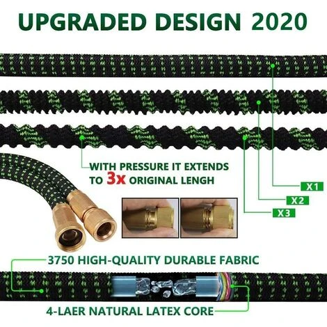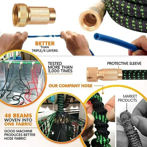 Mise à niveau en 2020:Tissu 3750D et latex à 4 grilles: Nous avons développé ce tuyau en utilisant les meilleurs matériaux de qualité et la dernière conception, évitant ainsi la plupart des problèmes: le tissu 3750x3750D peut empêcher l’écaillage, la durabilité de 4 couches de latex est de 2-3 3 fois la couche. En quelques secondes, la longueur du tuyau d’arrosage flexible est passée de 3M à 15M. Pendant l’utilisation, il ne se pliera, ne se tordra, ne se fissurera ou ne s’emmêlera jamais.