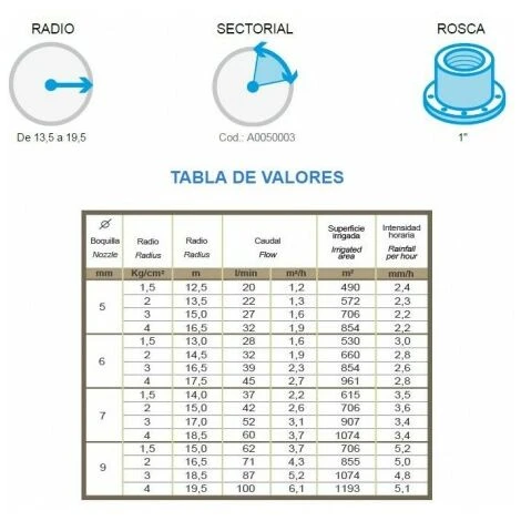 irrigation reglable drole Canyon gamme de 12,5 a 19,5 m . Pression de 1,5 a 4 bar . Connexion 1 » femelle Caracteristiques Marque Sime . Type circulaire . Executer. Coup Debit maximum 12 l / min . construction metallique . Diametre de raccordement 1 » femelle . Dimensions. 57x28x26 Poids 0,63 kg .