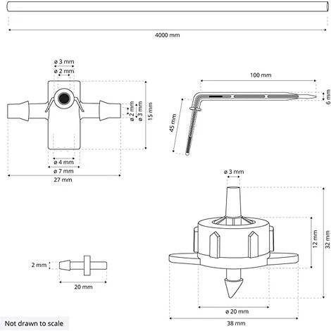 - Kit n°3 comprend : 4 m Tuyau PVC noir de 3×5 mm, 1x Goutteur bleu, 1x Raccord croix, 1x Adaptateur, 4x Émetteur-fl?che courbé