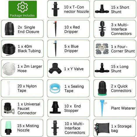 【40m + 2m Kit d’Irrigation Goutte 】– le? tuyau est fabriqué à partir de matériaux de haute qualité, résistants aux UV et aux produits chimiques, résolvant parfaitement le problème de la pression de l’eau. La conception étendue du tuyau de 40 m de long offre plus d’options pour les kit d’irrigation goutte de bricolage. L’installation est très simple, veuillez noter que lors du raccordement, vous devez chauffer le tuyau noir pour faciliter le raccordement. 【6 Modes De Connexion De Robinet】 — Il existe jusqu’à 6 conceptions innovantes de méthodes de connexion de robinet qui s’adaptent aux robinets non filetés et filetés de 1/2 « et 3/4 ». Micro irrigation automatique de le montage et démontage est très simple, vous pouvez également diviser le robinet en deux branches à l’aide d’un dispositif en forme de Y. Vous pouvez fermer un c?té de l’appareil en forme de Y à tout moment pour , effectuer un arrosage intelligent. 【4 Types De Constructions De Buses】 — le système d’irrigation jardin DIY dispose de 4 modes de buses d’irrigation, dont une buse d’atomisation, un goutteur réglable et 2 buses de fontaine. Il est équipé de 31 pièces et propose différents modes tels que l’arrosage, la fontaine et irrigation goutte à goutte. Chaque buse peut être ajustée individuellement selon les besoins et le débit d’eau peut être ajusté en tournant le goutte-à-goutte,plus d’économie d’eau. 【Arrosage Automatique Pour Jardin Avec Vanne De Régulation】– Equipé de dispositifs d’irrigation des plantes qui ajustent la vitesse de goutte en fonction des besoins en eau des plantes et délivrent l’eau directement aux racines des plantes. Le dispositif d’irrigation convient à la plupart des bouteilles, il vous aidera à résoudre le problème de l’eau stagnante ou de l’oubli sans surveillance, c’est un choixidéal pour les voyages d’affaires ou les vacances de courte durée. 【Convient à Plusieurs Occasions】– le kit d’irrigation goutte convient aux balcons, jardins, plantes de terrasse, serres et autres endroits où les plantes sont cultivées. Il peut également être un environnement de jeu pour les enfants à jouer dans le jardin en été. Les ensemble d’arrosage kit micro-goutte peuvent également réaliser l’arrosage à distance, l’atomisation,le dépoussiérage, l’humidification, le refroidissement et d’autres fonctions et rendre les plantes plus saines.