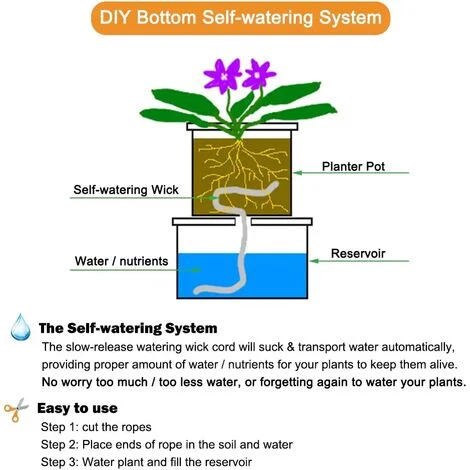 Système d’arrosage automatique DIY: placez une extrémité à une source d’eau en quantité suffisante, la mèche aspirera automatiquement l’eau à l’autre extrémité et s’égouttera dans les 15 minutes (le temps réel dépend de la longueur et du contrôle de la vitesse d’égouttage ; ou faire tremper la corde dans l’eau, il s’égouttera instantanément). Ce système d’arrosage automatique simple et économique, aide à prendre soin de vos plantes lorsque vous partez en voyage ou en voyage d’affaires.