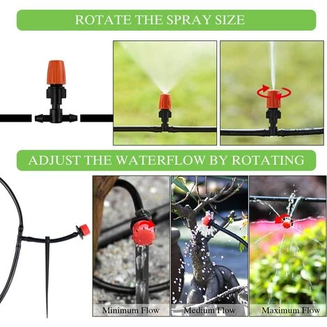 Tuyau en PVC 2 x 4 mm 15 m / 1 x connecteur 2 voies / 2 x raccords rapides / 1 x raccord téton / 1 x robinet d’étanchéité / 30 x goutteurs réglables / 20 x buses de pulvérisation / 30 x connecteurs en T / 20 x T plat / 30 x tiges fixes/2 x prises/10 x raccords cannelés.
