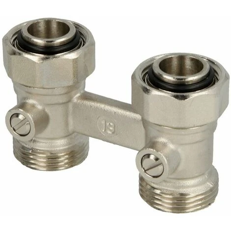 Le bloc de robinet double en forme droite est en laiton nickelé. Le raccordement pour le radiateur est de 3/4 » et le raccordement pour le tuyau est de 3/4 » eurocône. La distance entre les deux raccordements est de 50 mm.