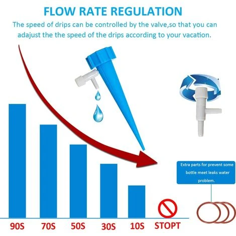 - Débit réglable – la vanne peut contrôler la vitesse de goutte à goutte de 0 à 60 s / 1 goutte à goutte, le goutte à goutte lent prend 1 à 15 jours, idéal pour un court voyage d’affaires ou de courtes vacances.
