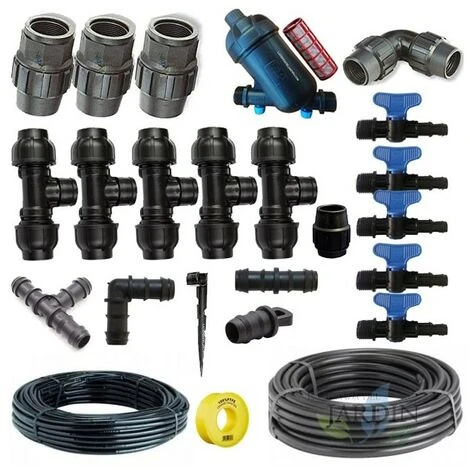 - Kit d’irrigation automatique pour irrigation goutte à goutte qui comprend le matériel suivant : 1 tuyau agricole 25 mm 6 bars de pression et 25 mètres de long. 1 filtre maille 3/4″ 120 Mesh. 3 raccords filetés femelle PE 25mm x 3/4″. 1 coude polyéthylène 25 mm. 1 tube de 16 mm avec goutteurs tous les 33 cm, bobine de 100 mètres. 5 Té femelle 25 x 3/4″ PE. 1 Embout PE 25mm. 1 Téflon 12mm 12 mètres.