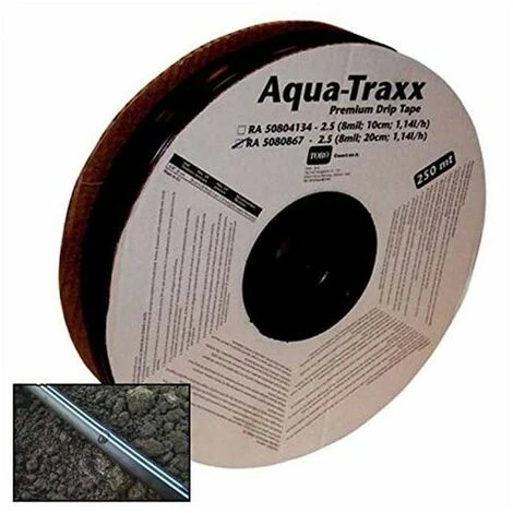 - Calibre 8000, mur de 8 mils. Séparez les goutteurs tous les 20 cm. Débit 1,16 l / h. Bobine de 250 m