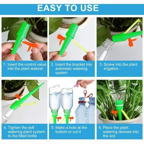Water Arrosage automatiqueAvec la vanne pour contrler la vitesse d’coulement, vous pouvez ajuster la vitesse de goutte goutte par la vanne. Avec ce rgulateur de gouttes de plantes, vous naurez plus besoin de vous soucier de vos fleurs ou de vos plantes pendant quelques jours. ce que vous devez faire est d’insrer les pointes dans la plante en pot la racine.